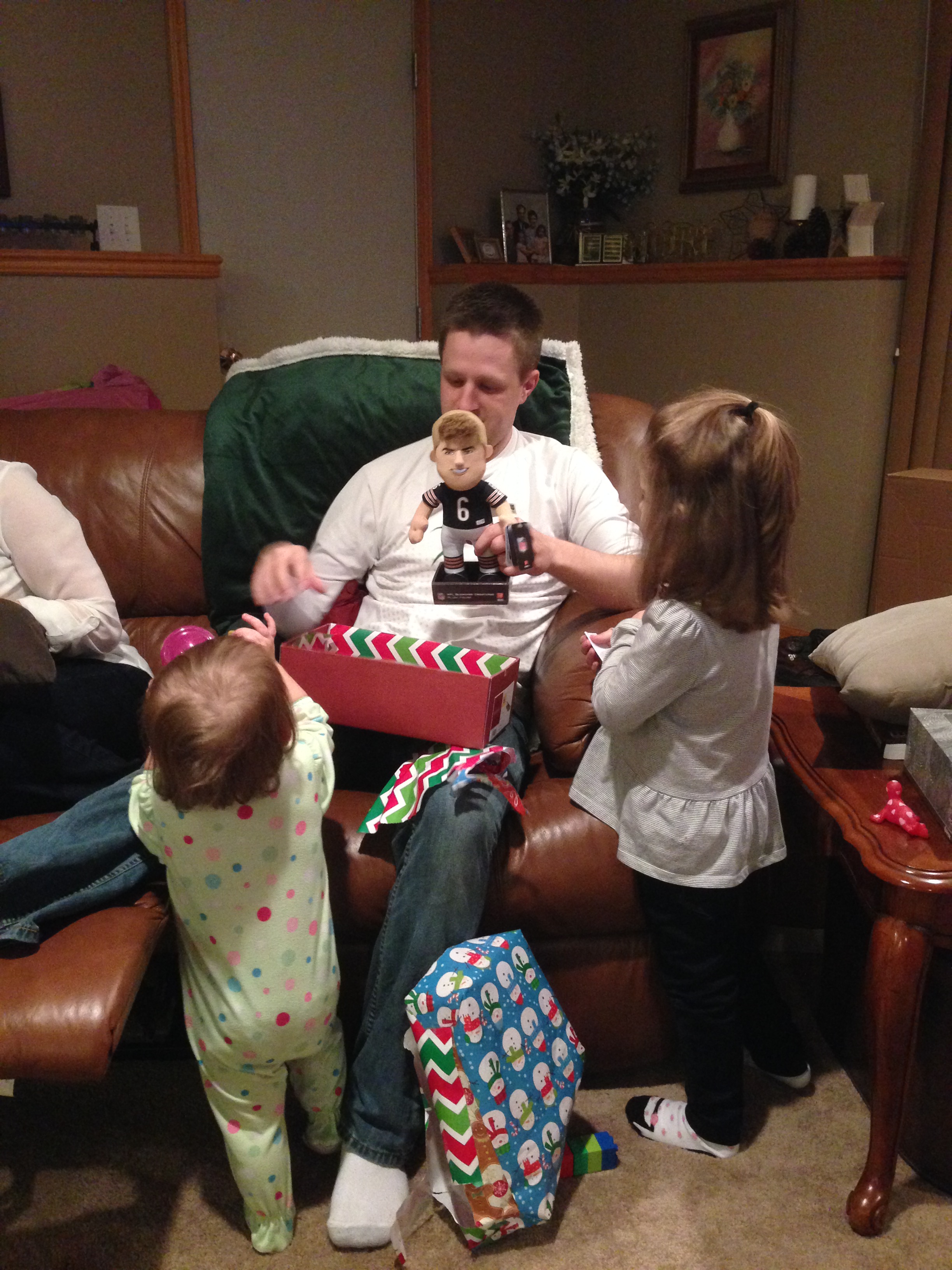 Ellie says, “Ack!! Santa made a mess on the fireplace!!” Also, there was no snow in Chicago for Christmas,so I’m not sure how Santa left snowprints, but the little ones didn’t catch that little blunder.