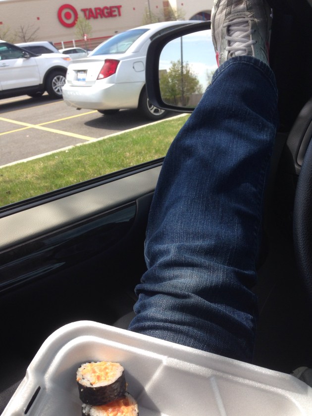 So I’m sitting in a Target parking lot, feet up on the dashboard, windows open, stuffing my face with a spicy tuna roll.