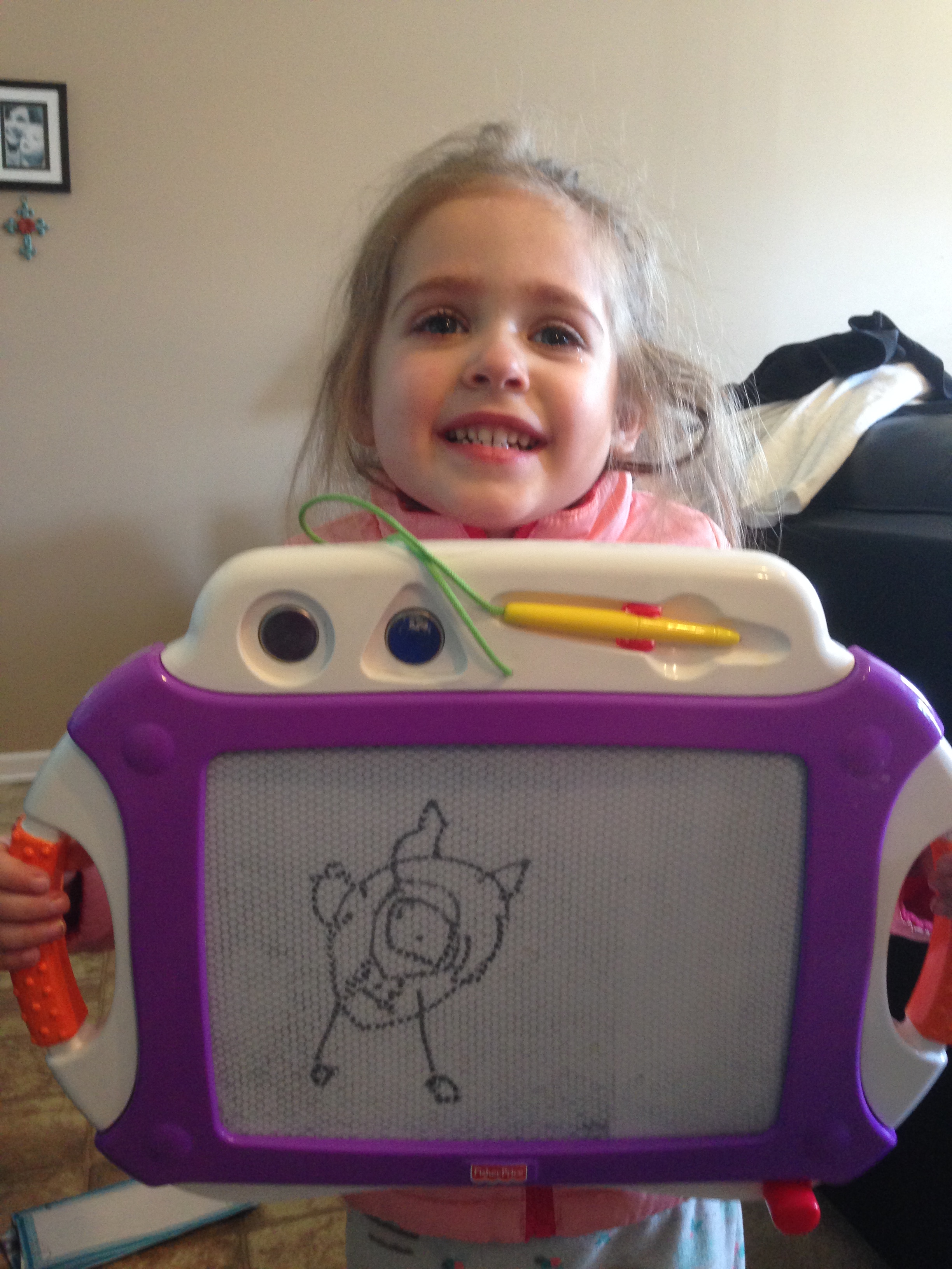 I hear that those are pretty good for a three-and-a-half year old (though she is now getting much closer to FOUR than I care to admit). We have some artists in our family (especially my mother in law) so I’m sure that she could have some artistic talent. I’m not sending these off to the Louvre quite yet, but hey, if the kid can draw, that’d be pretty cool.